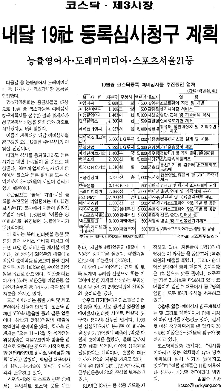 부일산업(주)는 2001년 9월 1일 부로 LG증권을 주간사로 코스닥 등록 계약을 마쳤으며, 10월 6일 예 비심사