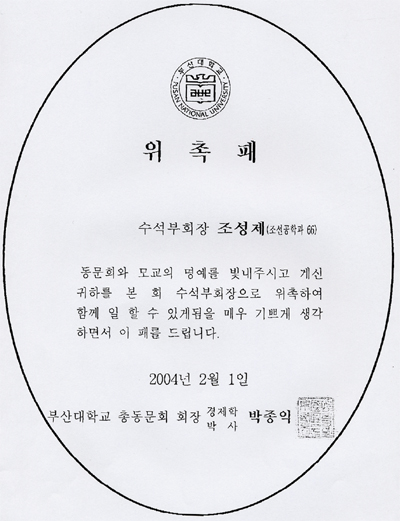 부산대학교 총동문회 수석부회장으로 BIP GROUP 조성제 회장을 위촉하였다