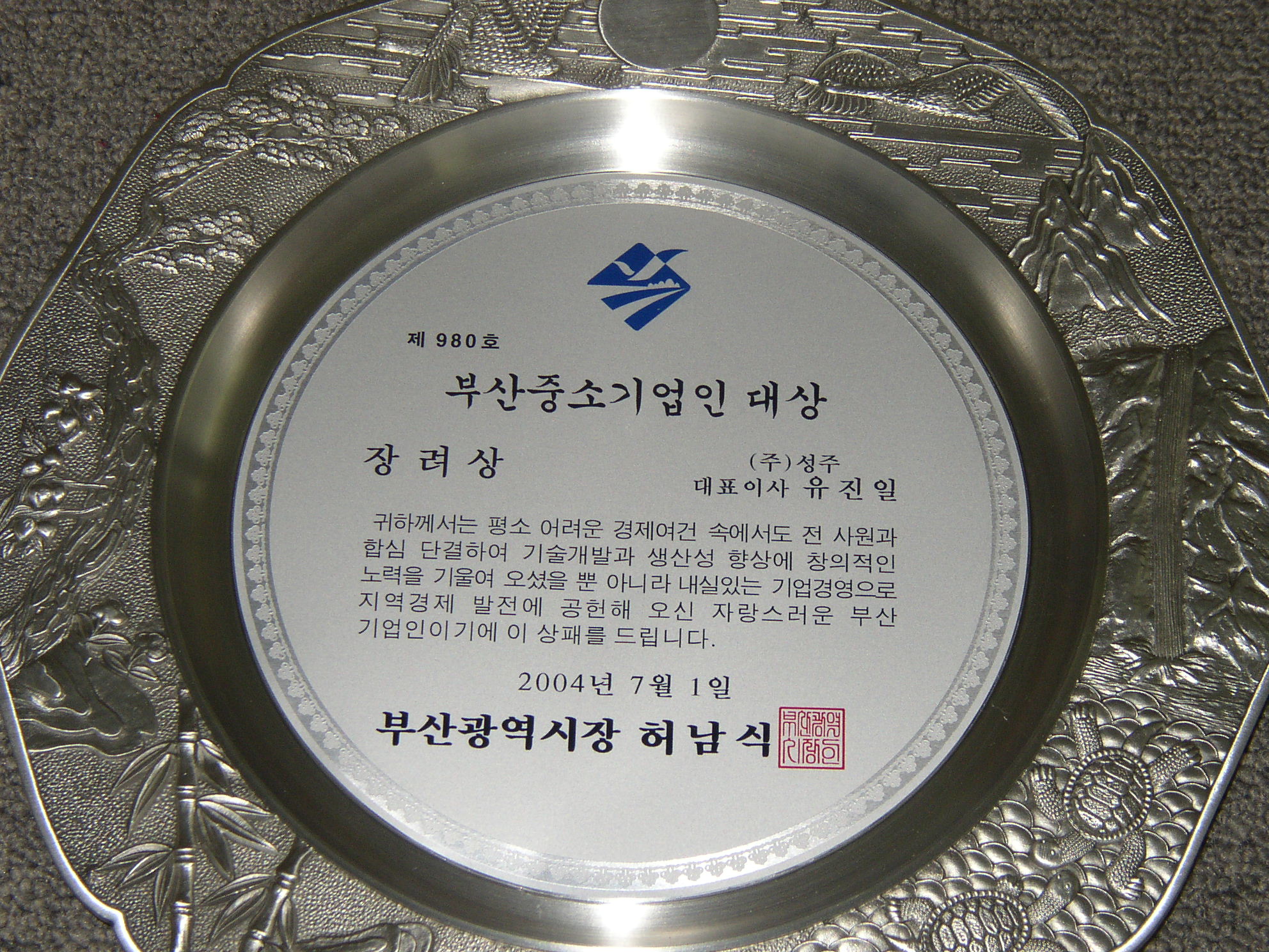 2004년 7월 1일 부산시청 대강당에서 있었던 부산시 중소기업인대상 시상식에서